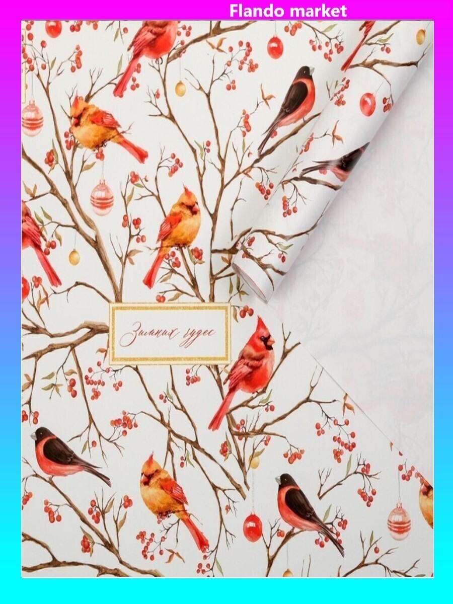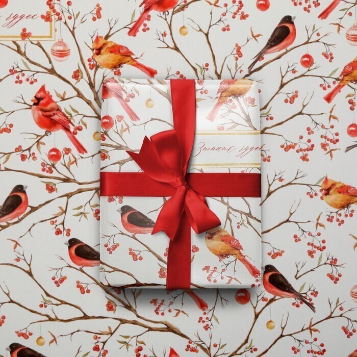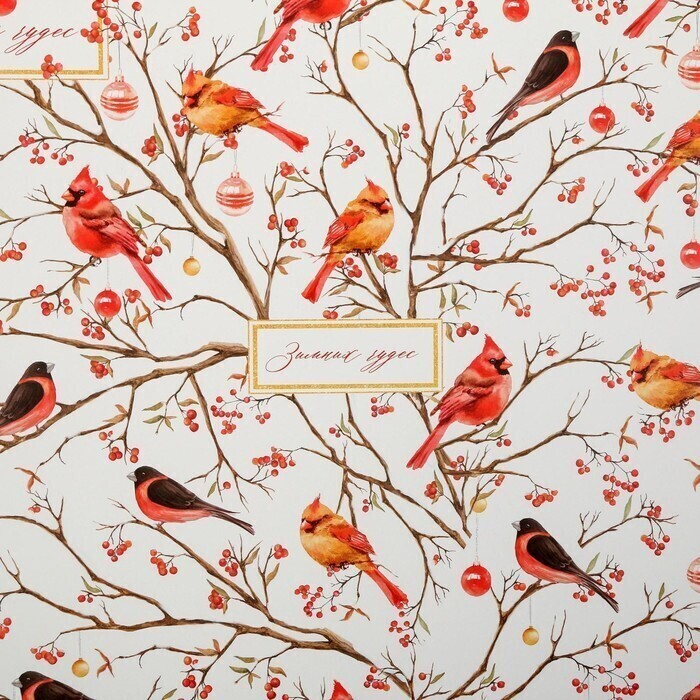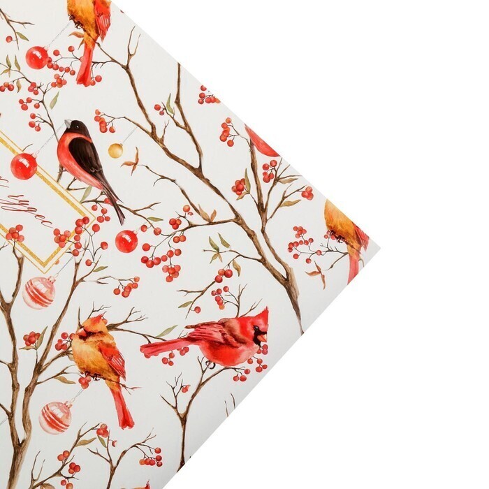 !09 Бумага упаковочная 2 листа глянцевая, "Птицы на ветвях", 50 х 70 см.