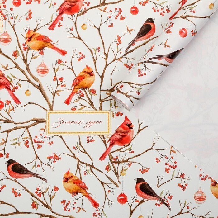 !09 Бумага упаковочная 2 листа глянцевая, "Птицы на ветвях", 50 х 70 см.