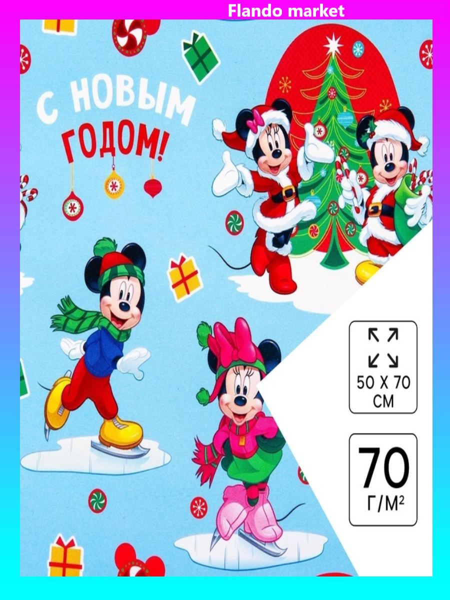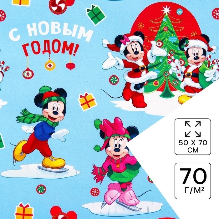 !09 Бумага 3 листа упаковочная глянцевая, 50 х 70 см «Весёлого Нового года!», Микки Маус