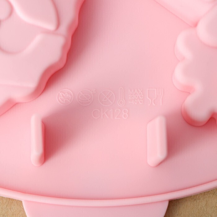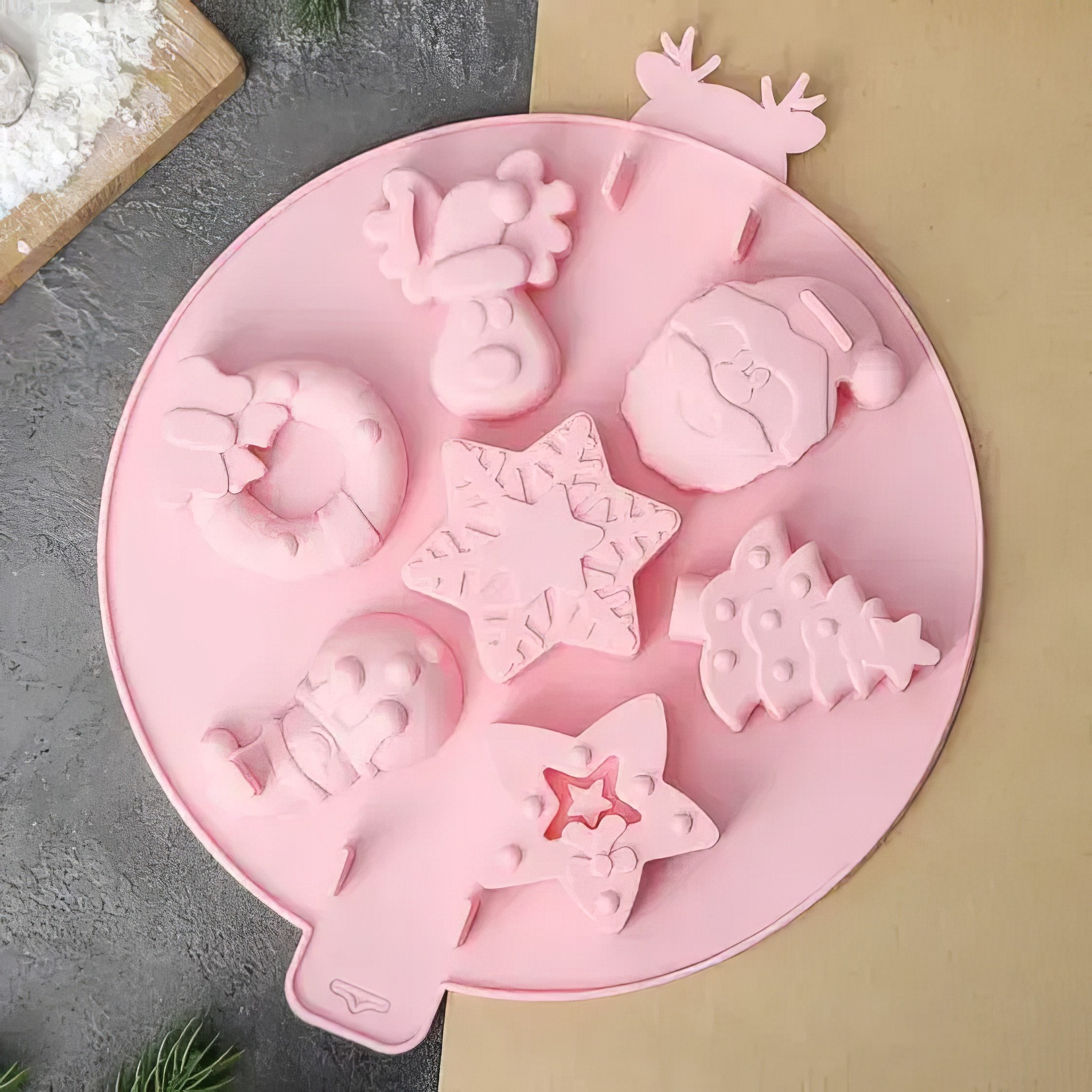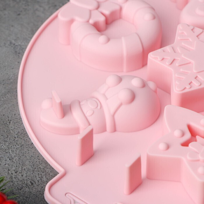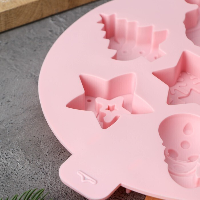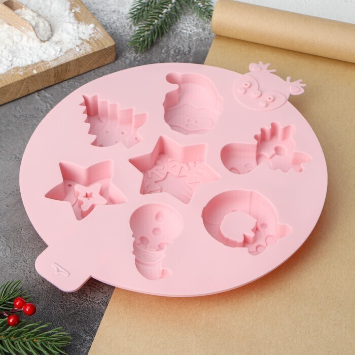 !09 Форма для выпечки «Новый год», силикон, 23×23×2,3 см, 7 ячеек, розовая