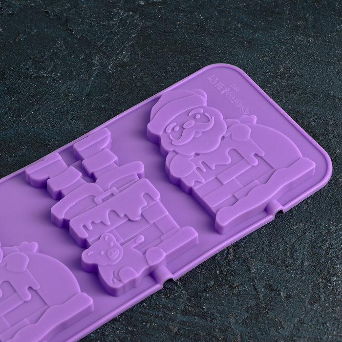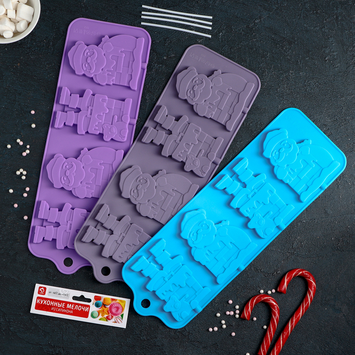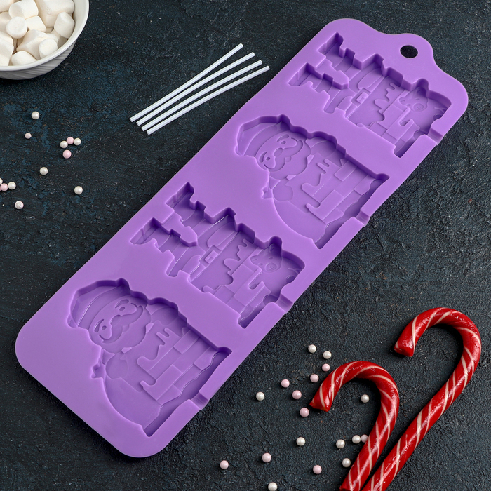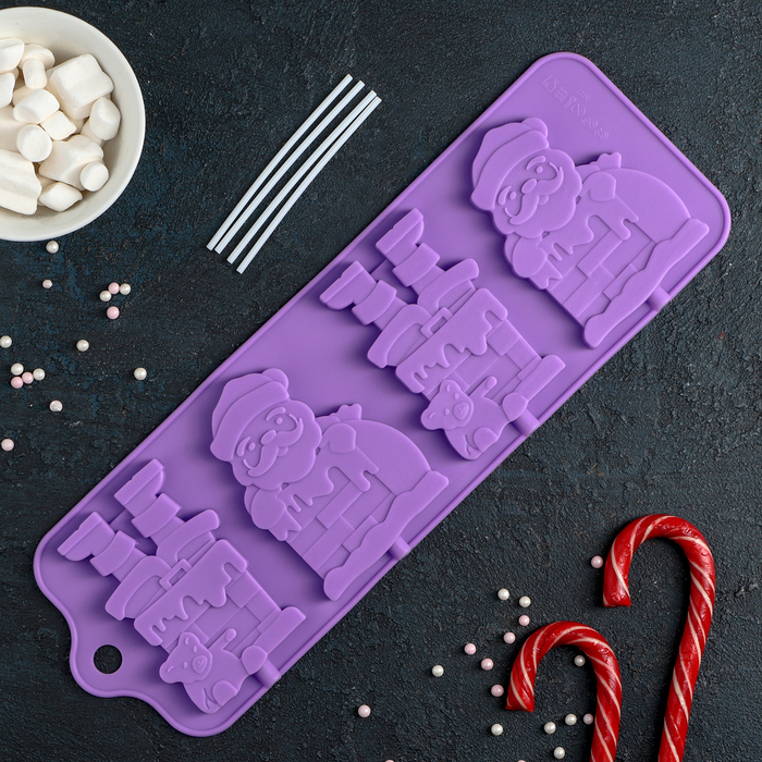 !09 Форма для леденцов новогодняя «Дед Мороз», силикон, 36×12 см, 4 ячейки (10,2×7,5 см), с палочками, цвет МИКС