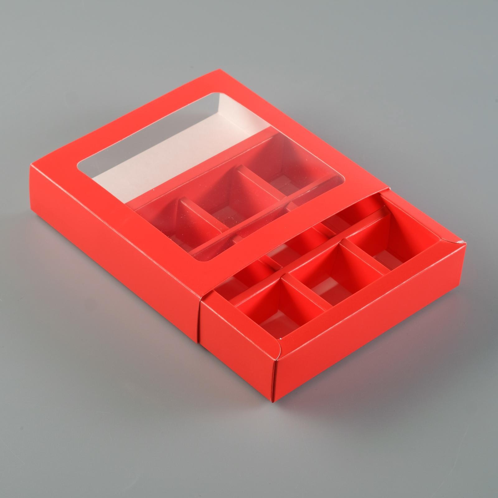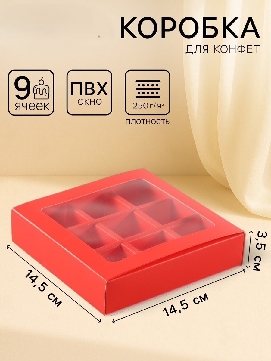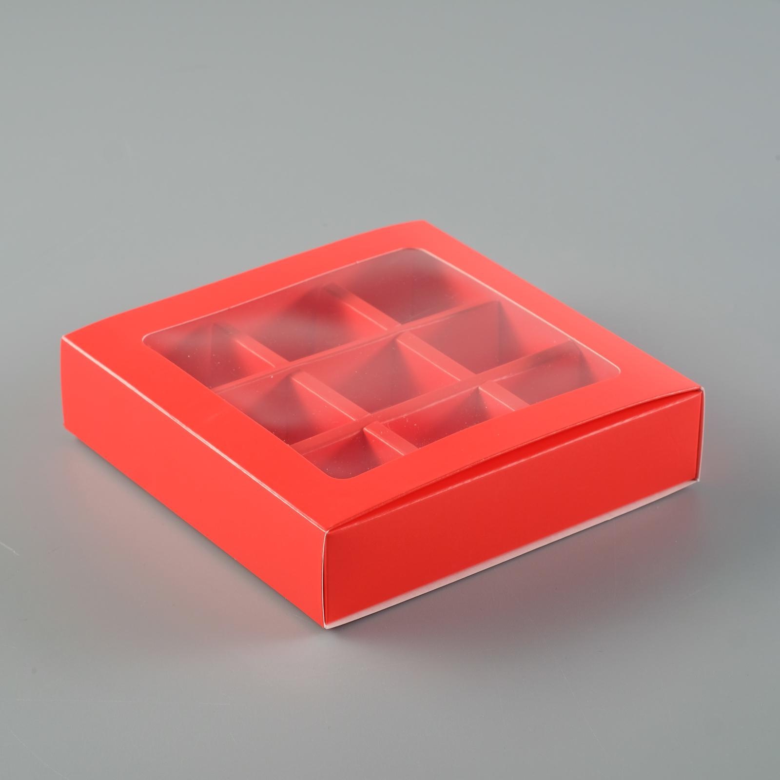 !09 Коробка (набор 2 штуки) под 9 конфет с обечайкой с окном 14,5 х 14,5 х 3,5 см. цвет красный