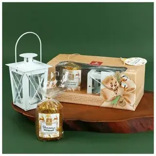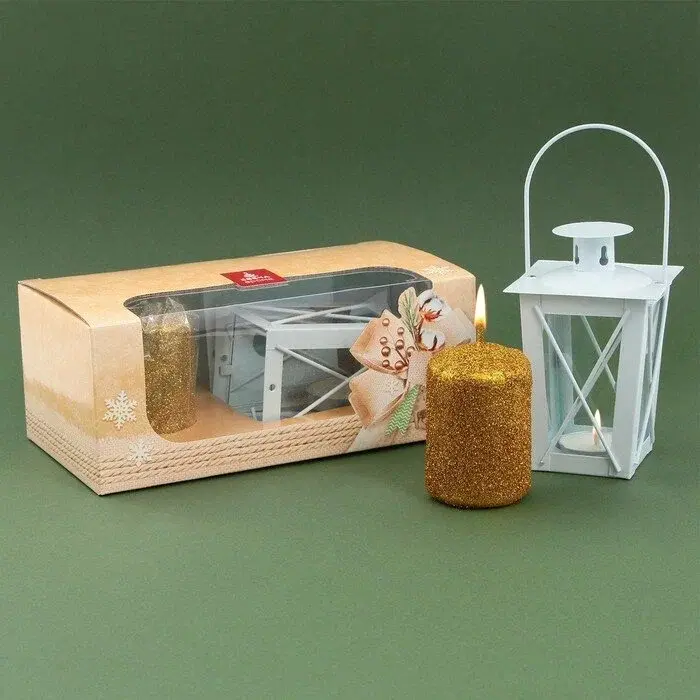 Cвеча столбик и фонарик «Исполнения желаний», новогодний набор. В подарочном наборе есть все необходимое для праздничного настроения и создания атмосферы Нового года в вашем доме. В наборе вы найдете свечу (без аромата) - 4,5 х 4,5 х 7 см., металлический подсвечник 7,5 х 7,5 х 11 см в комплекте с чайной свечой, диаметром 3,5 см.