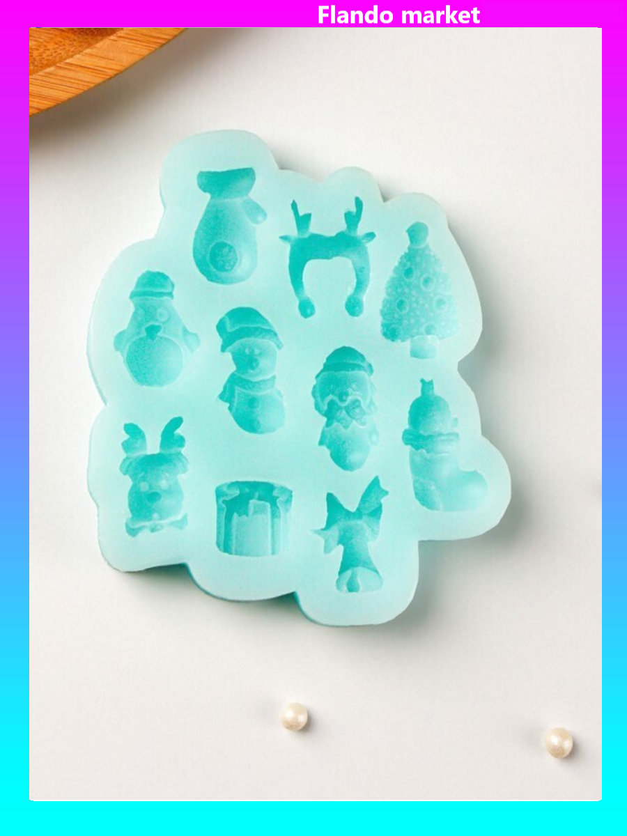 !09 Молд для заливки новогодний «Новогодний микс», силикон, 8×8 см, бирюзовый