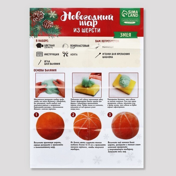 Этот набор - отличный повод провести волшебный творческий вечер! Предложите малышу создать своими руками уникальные украшения для вашей ёлочки. Основные характеристики * Размер коробки 9,5 х 9,5 х 14,5 см * Размер шара 16 х 12 см * Натуральные материалы Что входит в набор? * пенопластовая основа * цветная шерсть для валяния * лента * игра для валяния * инструкция Создаём новогоднюю атмосферу вместе со «Школой талантов»!