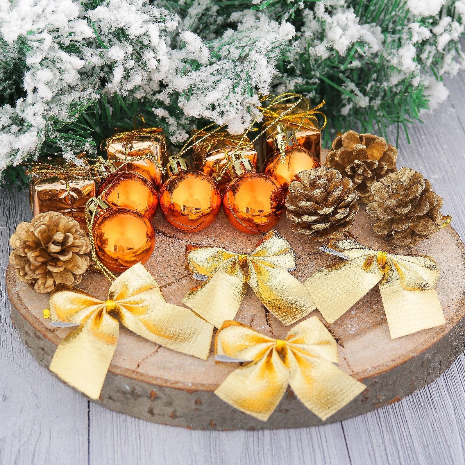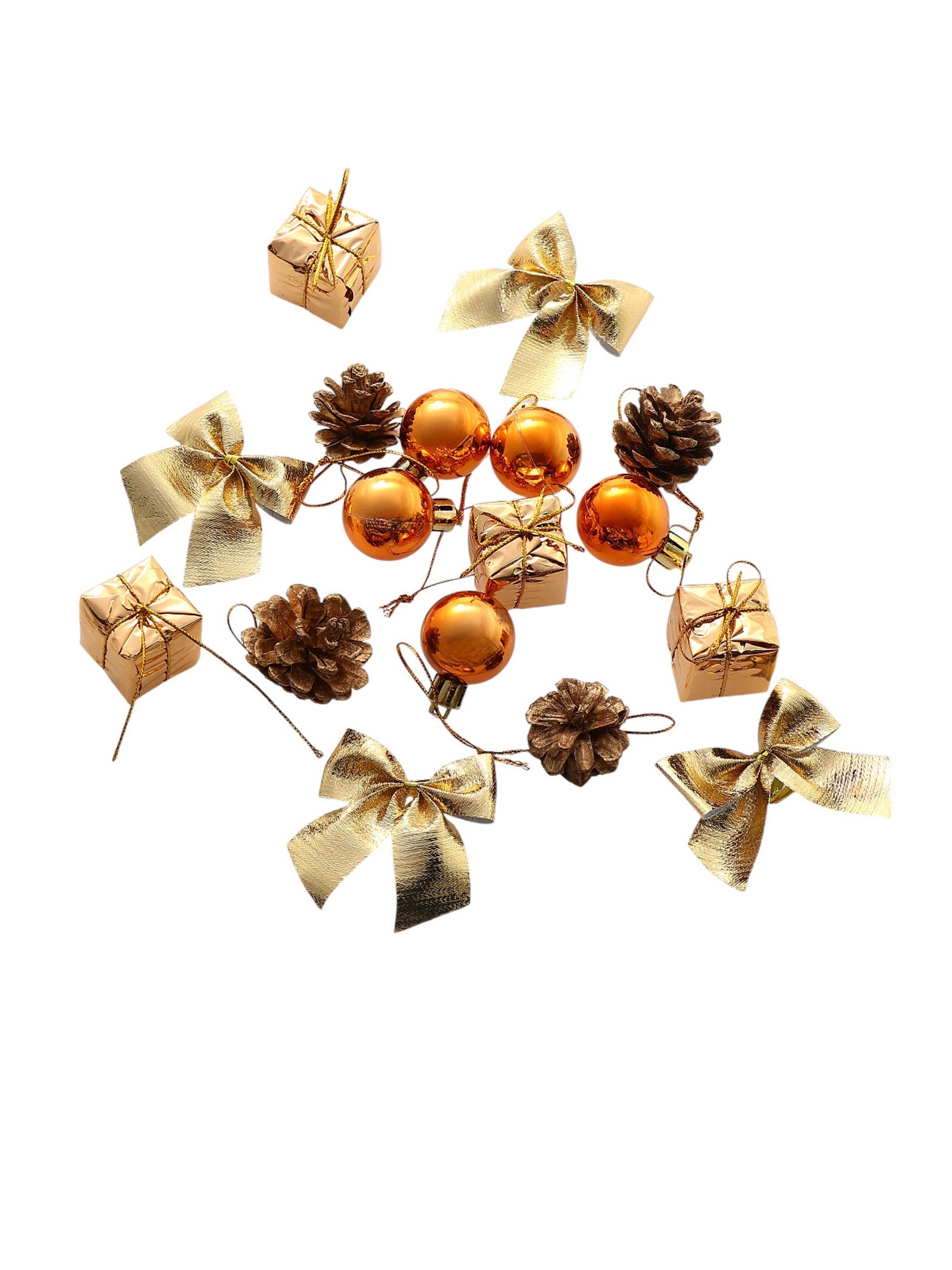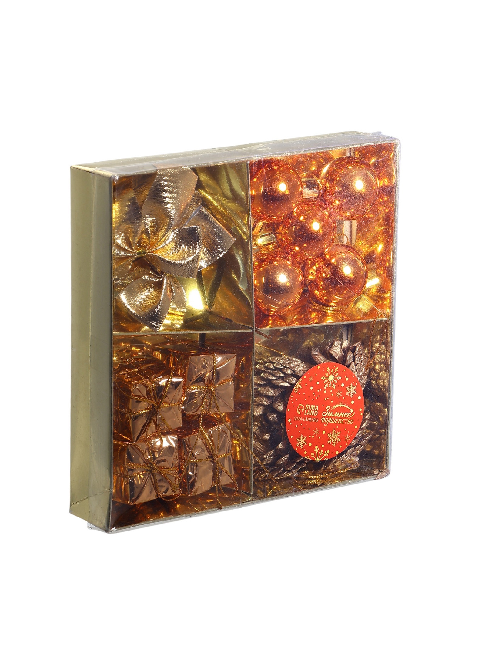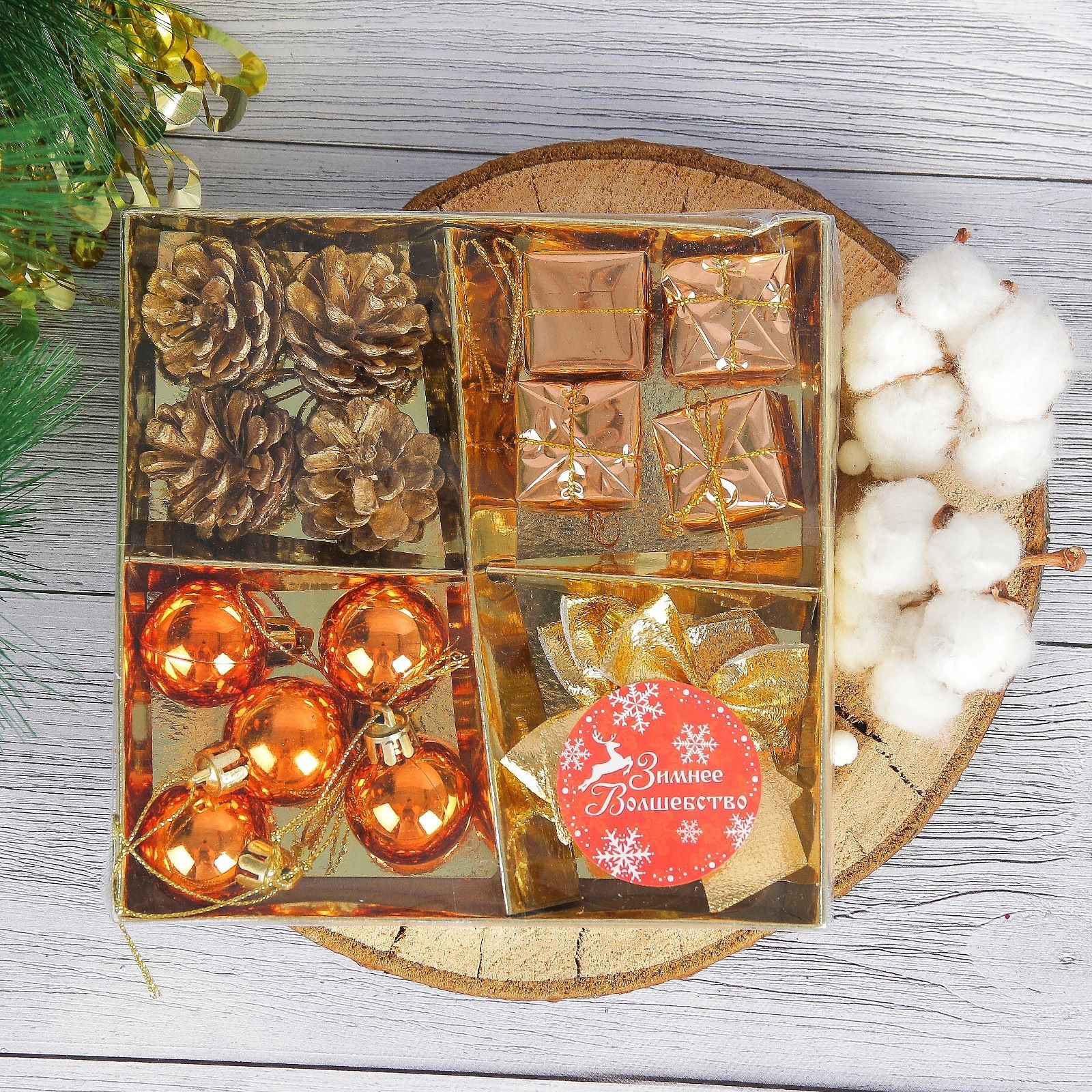 !09 Ёлочные игрушки «Сюрприз», шары новогодние, набор 17 штук (4 шишки, 4 подарка, 4 банта, 4 шара, 5 шариков) цвет коричнево-золотой