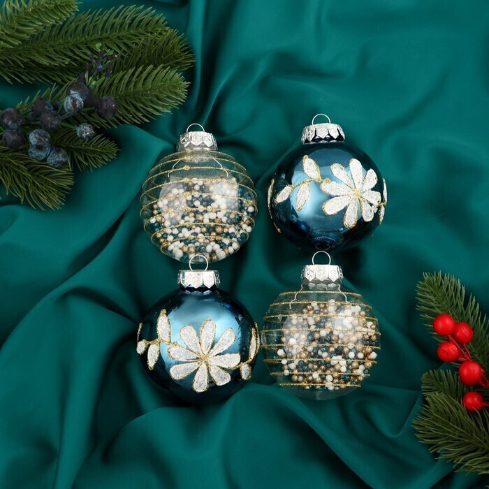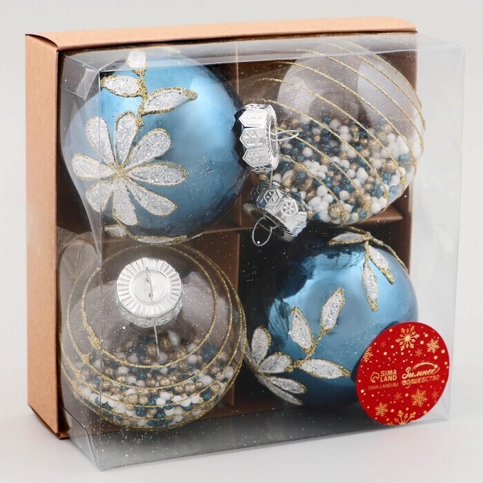 !09 Набор елочных шаров (набор 4 штуки) "Вивьен" пластик d-8 см. цвет бело-синий
