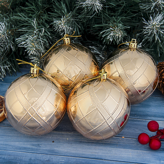 !09 Набор елочных шаров (набор 4 штуки) "Переплет" пластик d-8 см. цвет золотистый