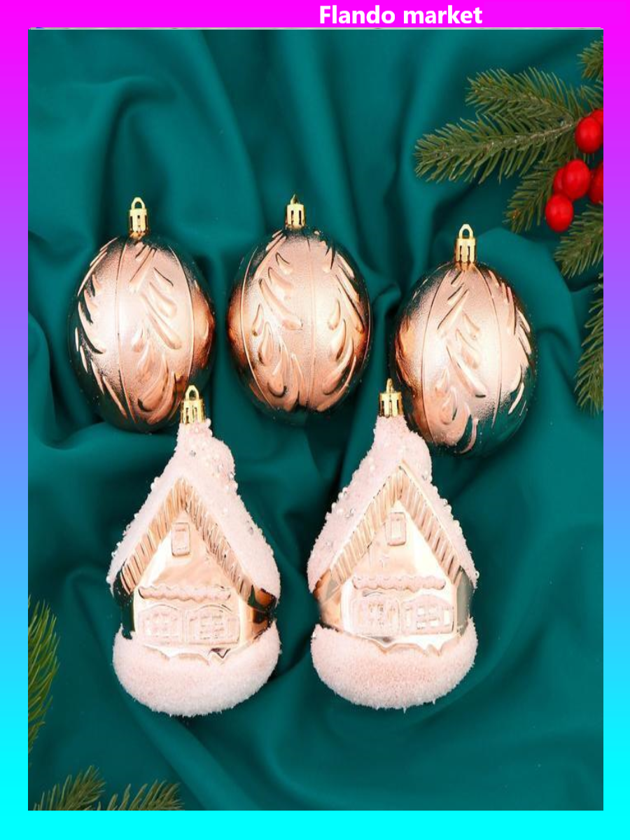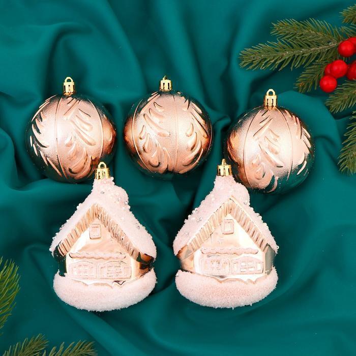 !09 Набор елочных украшений (набор 5 штук) "Домик" пластик (3 шара d-7,5 см, 2 домика)