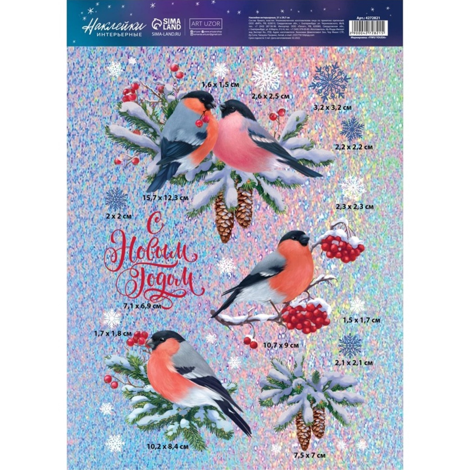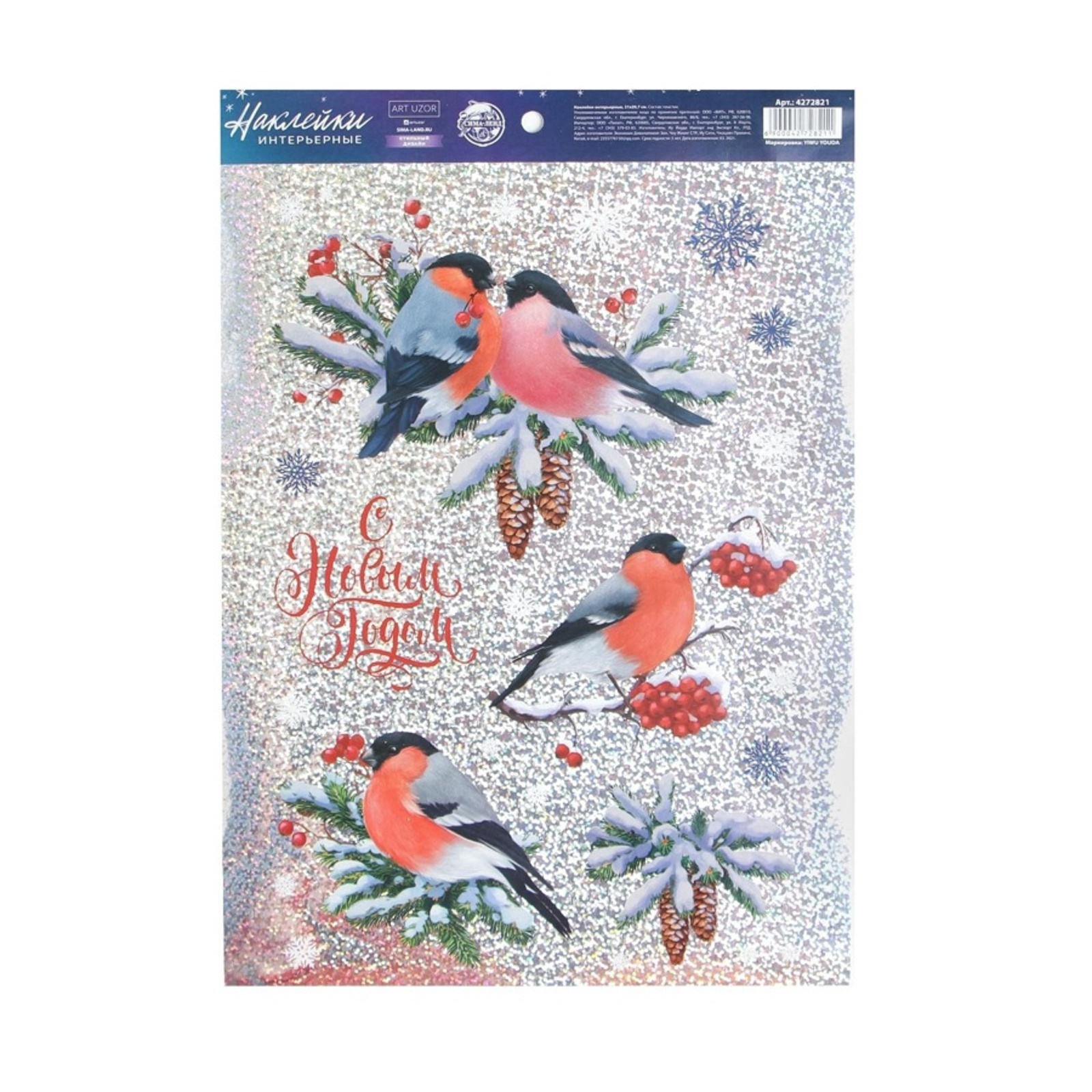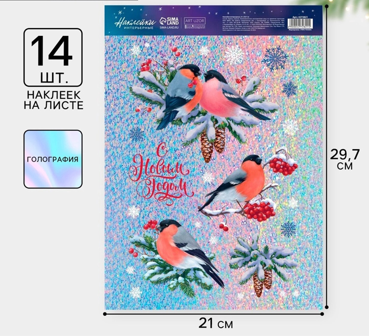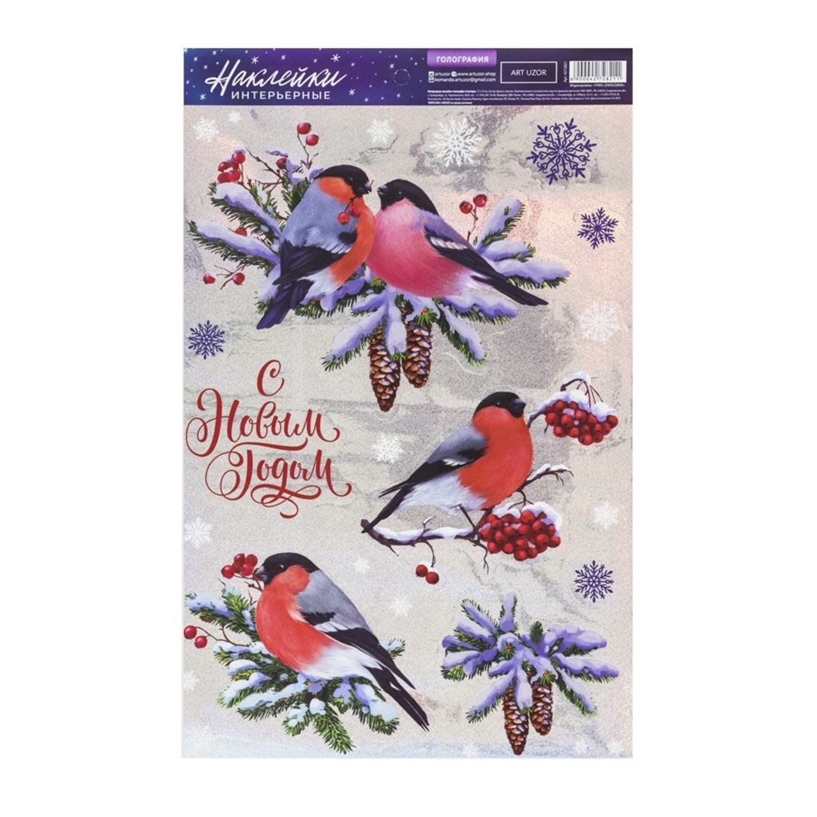 !09 Набор из 2-х штук: Наклейки новогодние интерьерные «Снегири», голография, 21×29.5 см