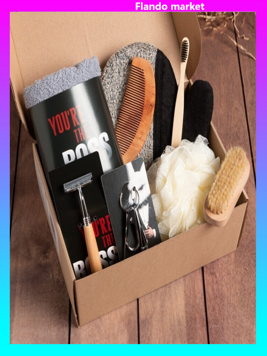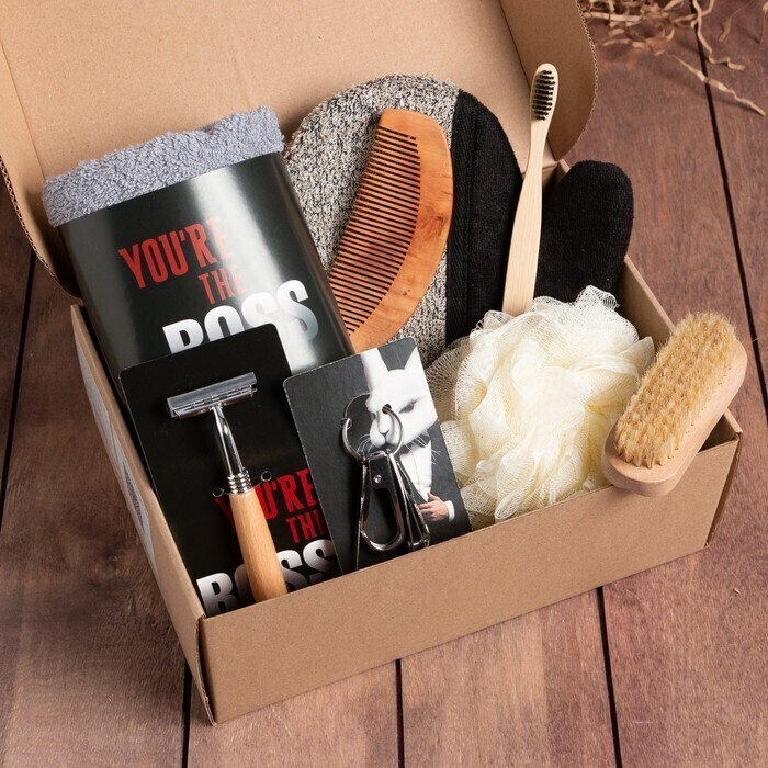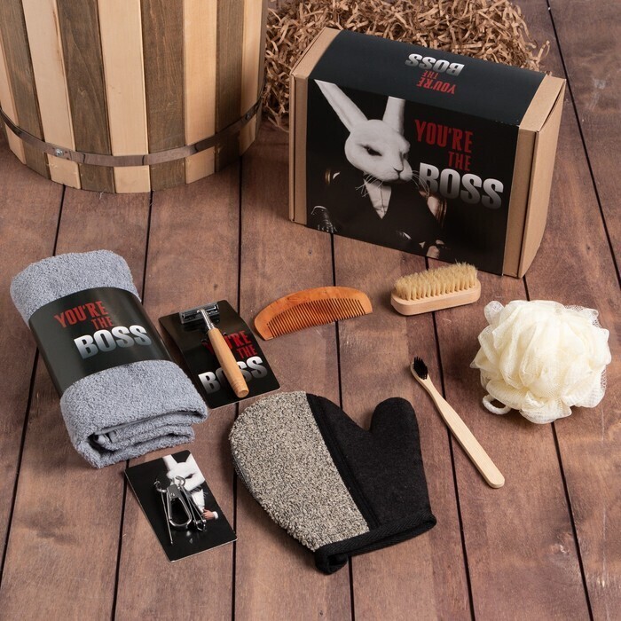 !09 Набор подарочный Boss полотенце 8 предметов (Бритвенный станок, Варежка-мочалка, Зубная щётка, Мочалка, Полотенце, Принадлежности для маникюра, Щётка)