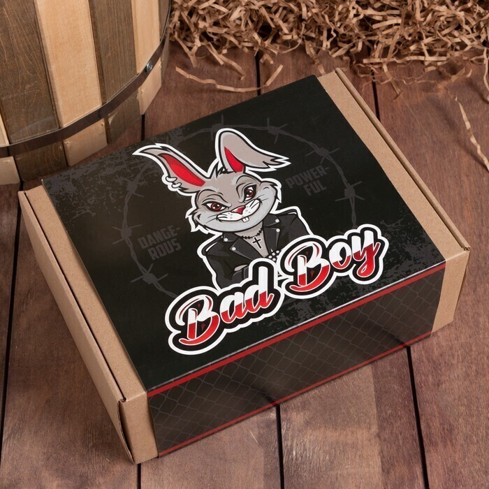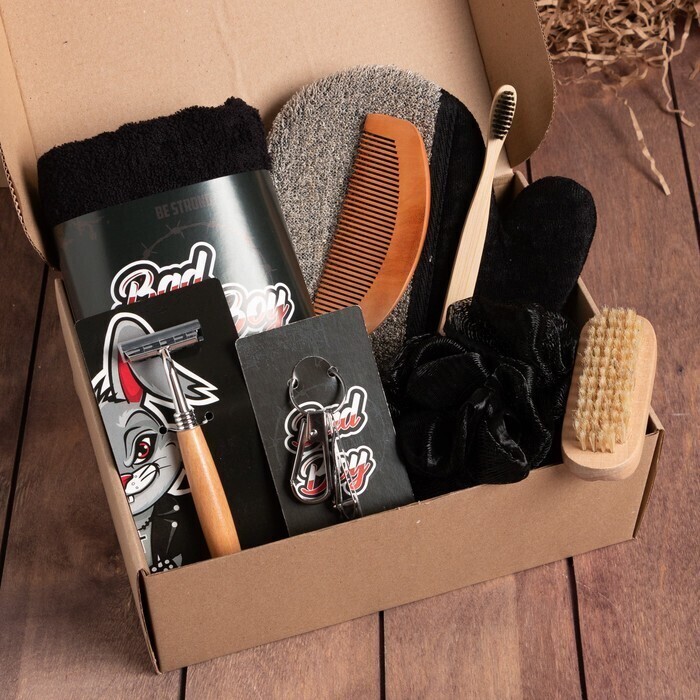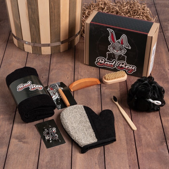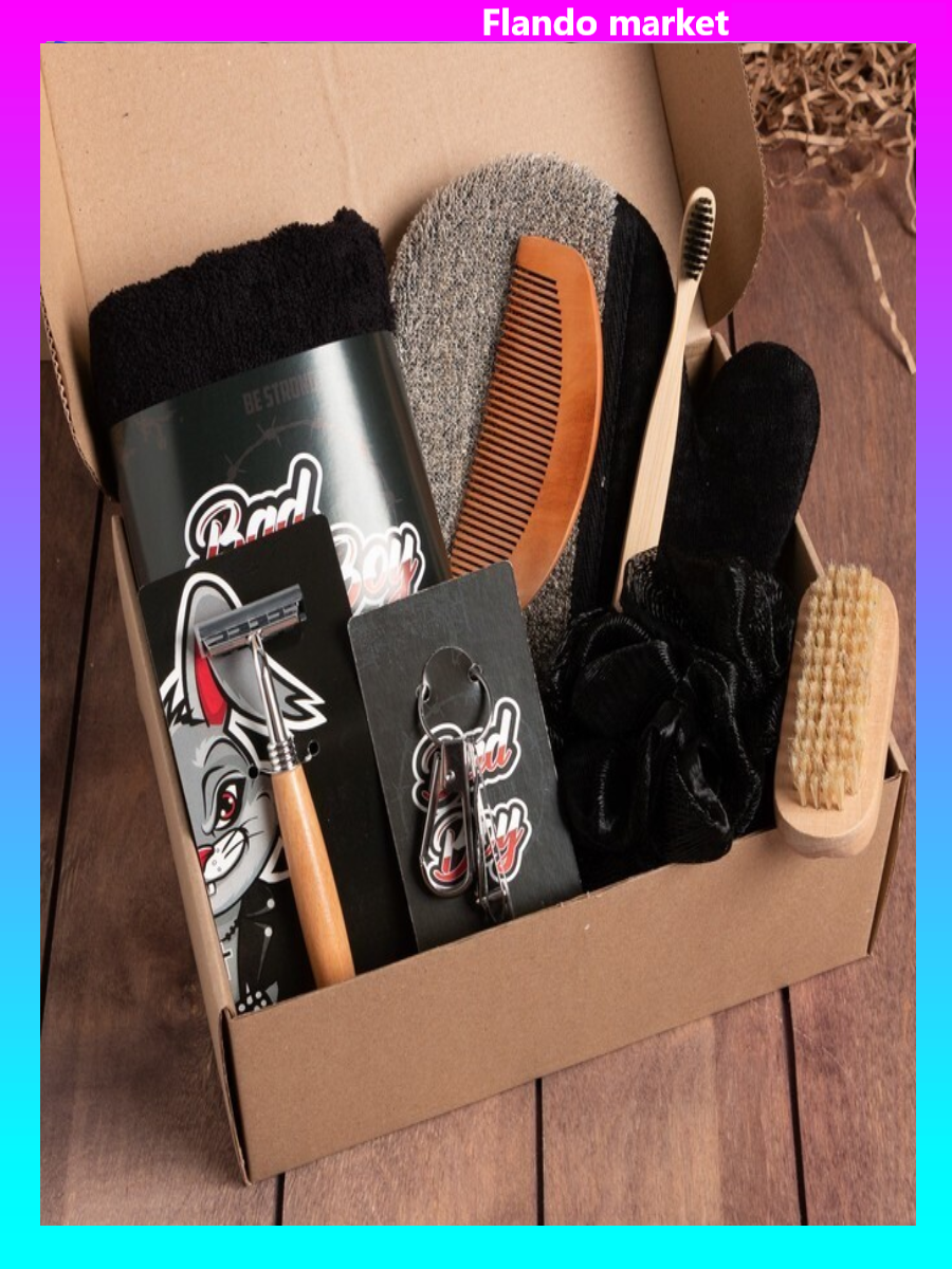 !09 Набор подарочный Danger boy 8 предметов(Бритвенный станок, Варежка-мочалка, Зубная щётка, Мочалка, Полотенце, Принадлежности для маникюра, Щётка)