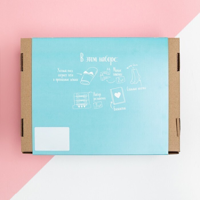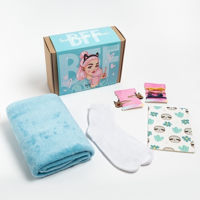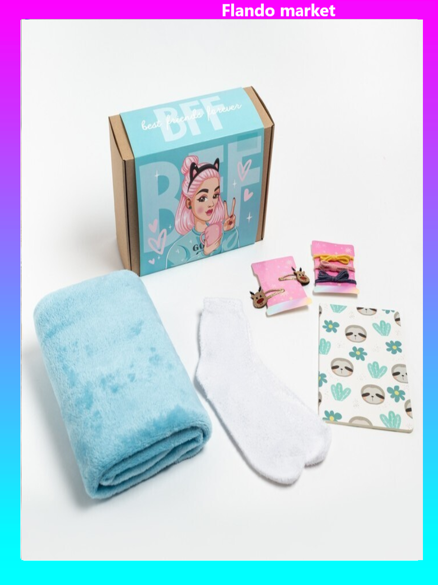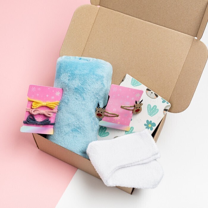 В набор входит: * Плед – 85х100 см, * Носки – 36-40 (23-25 см), * Набор резинок – 3 шт, * Набор заколок – 2 шт, * Блокнот А5 – 32 л.