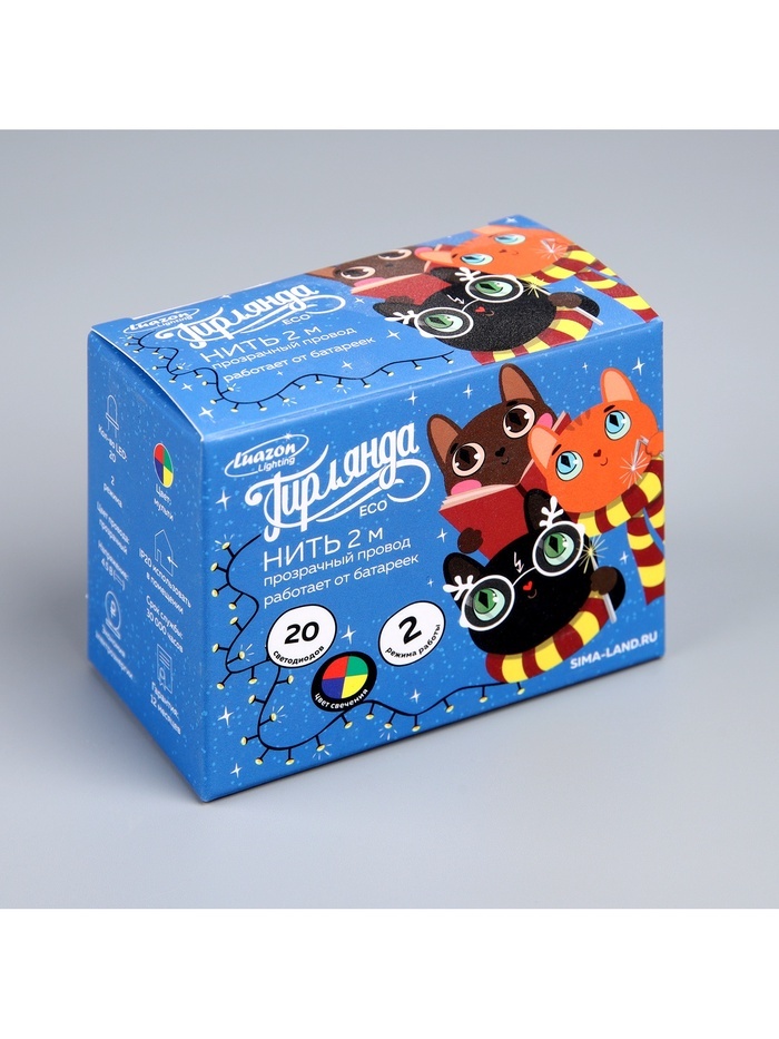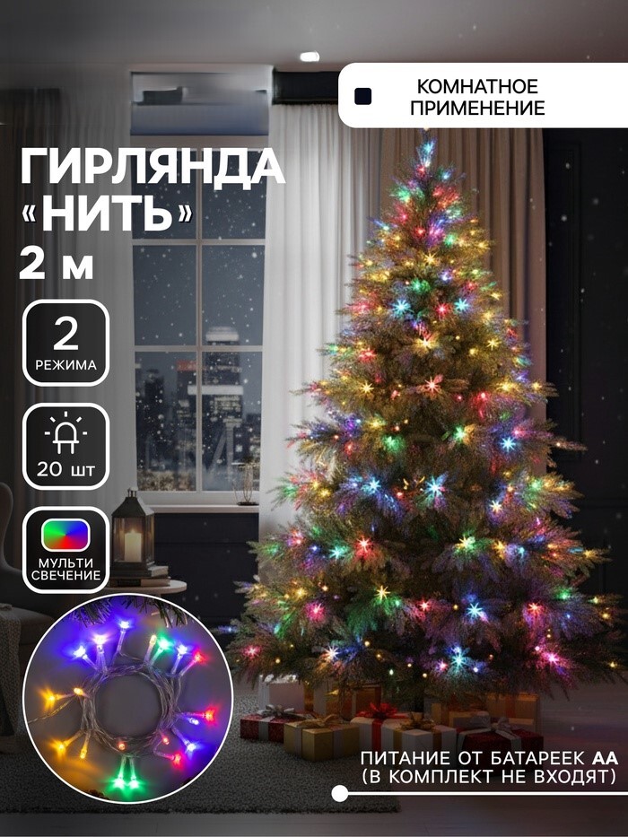 !09 Набор из 2-х гирлянд - Гирлянда «Нить» 2 м, IP20, прозрачная нить, 20 LED, 2 режима, батарейки AAх3 (нет в комплекте), свечение мульти