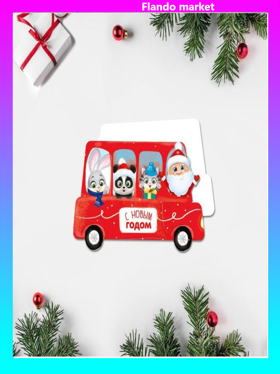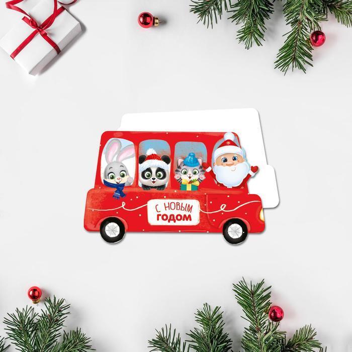 !09 Открытка под конфету (набор 5 штук) «С новым Годом!» автобус со зверятами, 9 × 6 см.