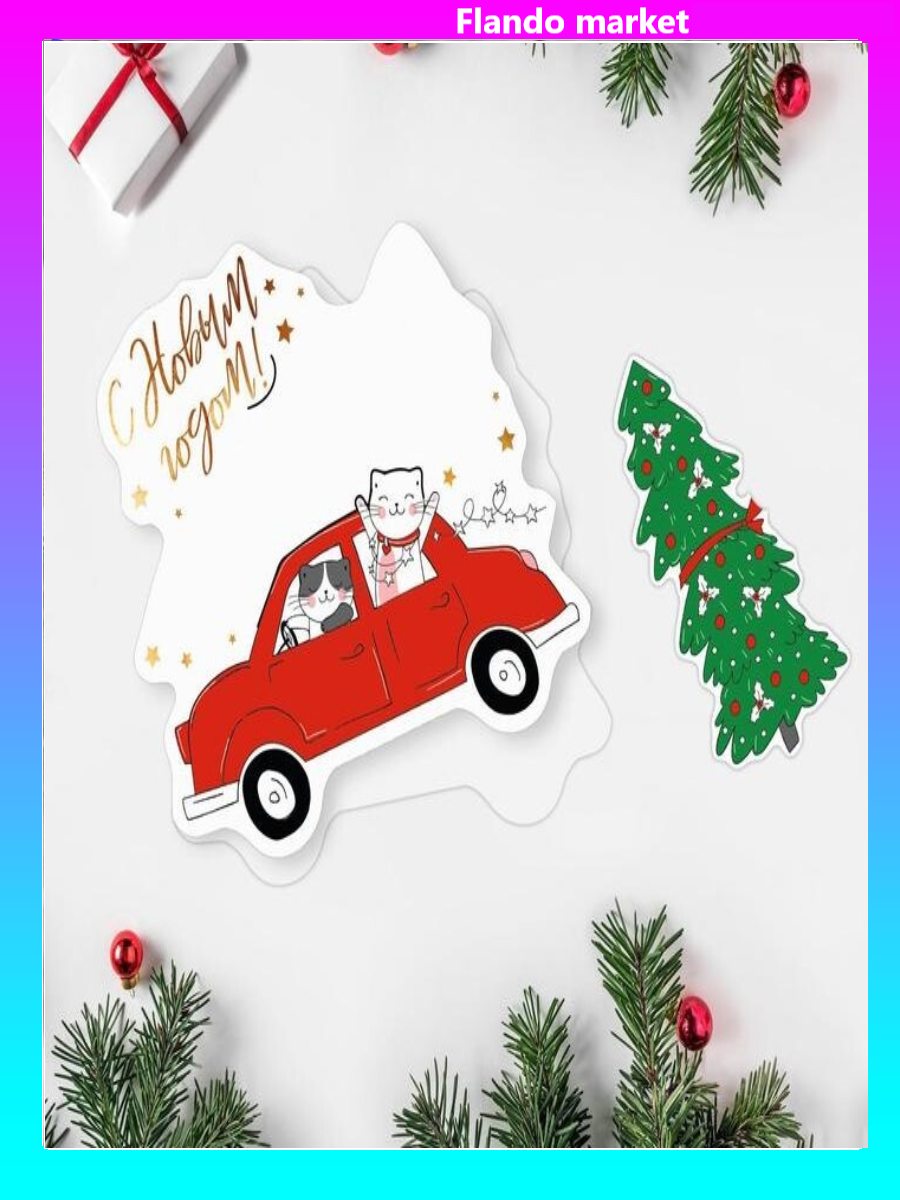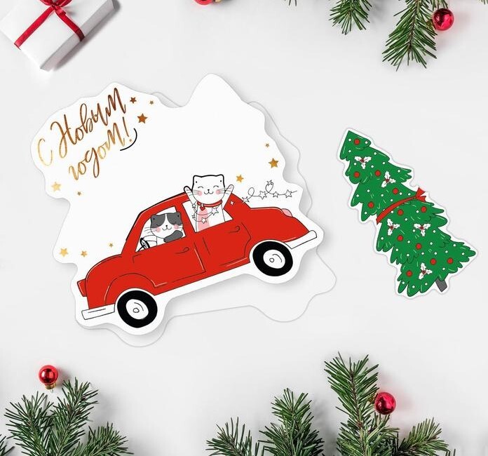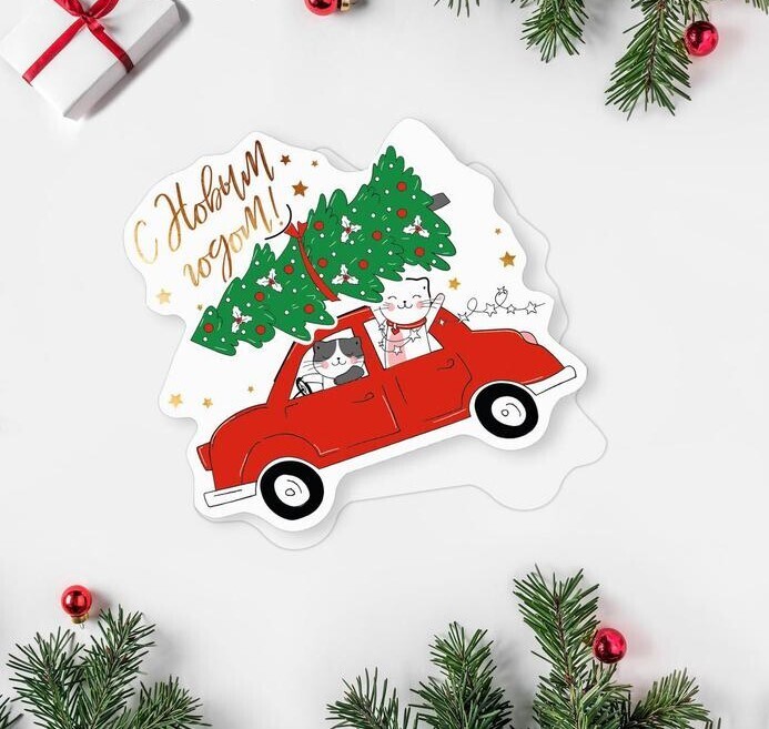 !09 Открытка поздравительная (набор 6 штук) «С Новым Годом!» Коты на авто, 8 × 8 см.