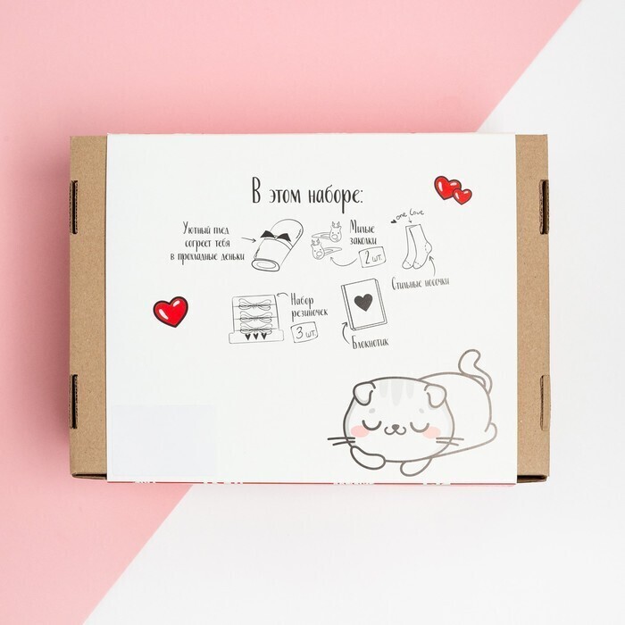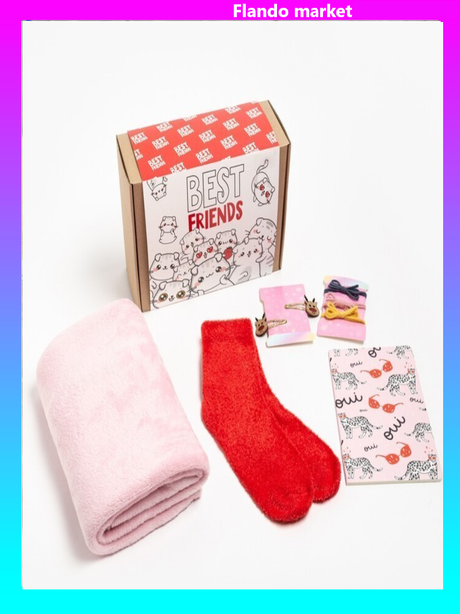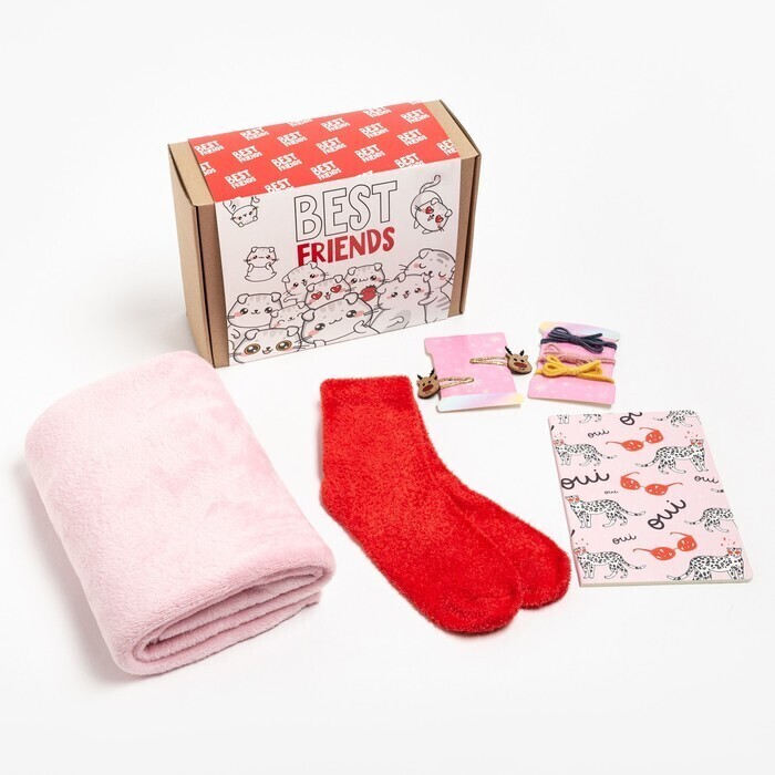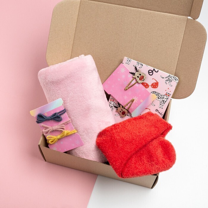 В набор входит: * Плед – 85х100 см, * Носки – 36-40 (23-25 см), * Набор резинок – 3 шт, * Набор заколок – 2 шт, * Блокнот А5 – 32 л.