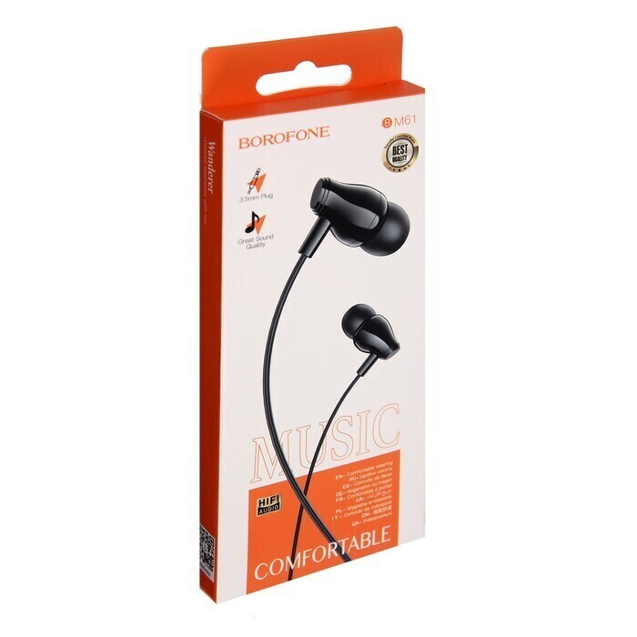 !09 Набор 2 штуки - Наушники Borofone BM61 Wanderer, вакуумные, микрофон, Jack 3.5 мм, кабель 1.2 м, чёрные