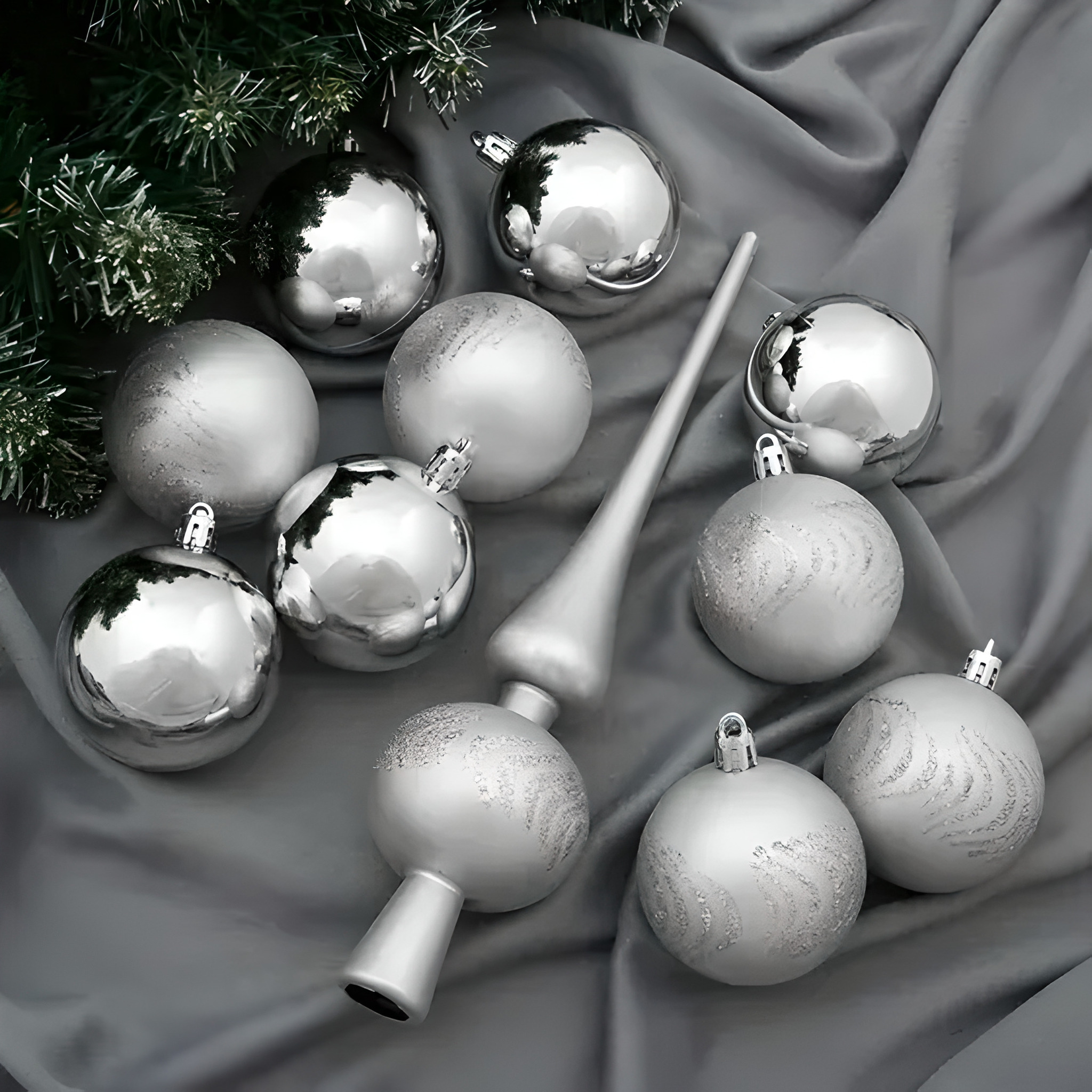 !09 Ёлочные игрушки «Изгибы», шары новогодние, набор с верхушкой 21 шт., серебро