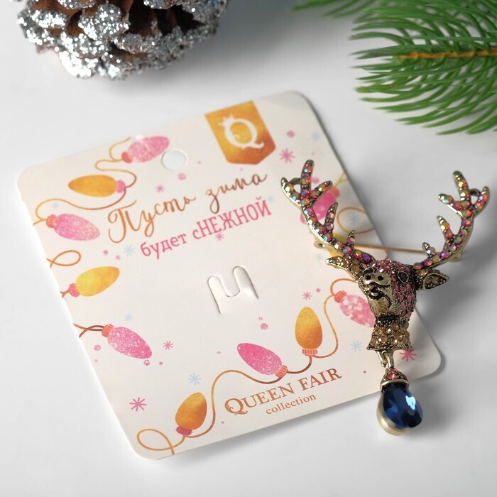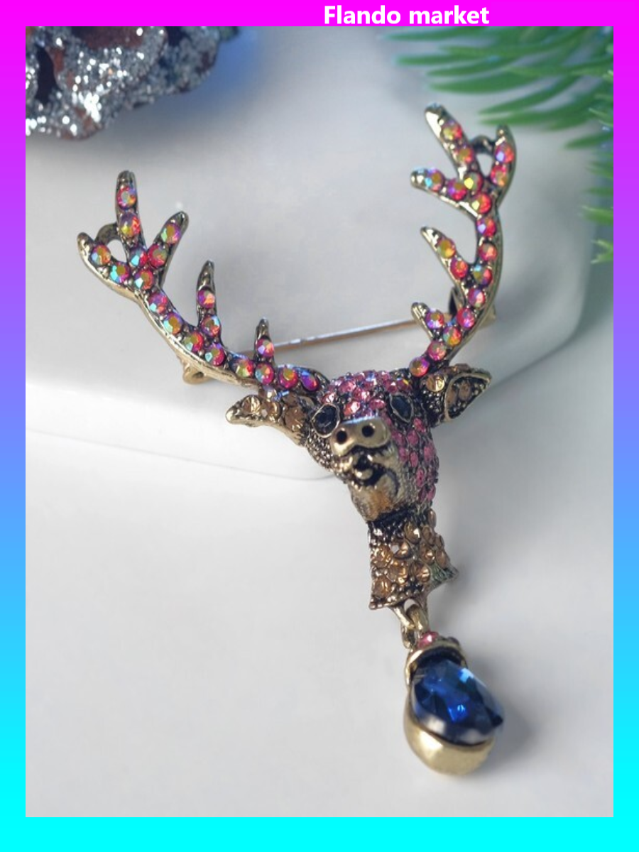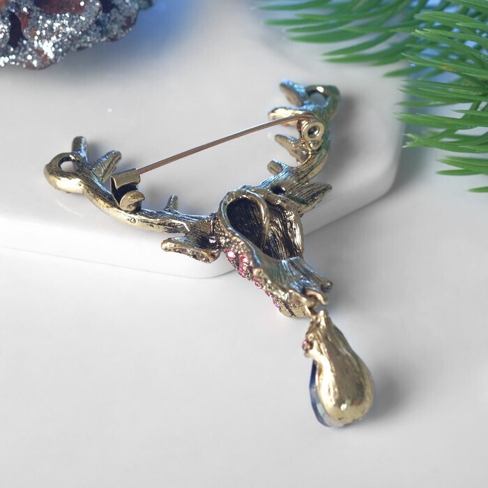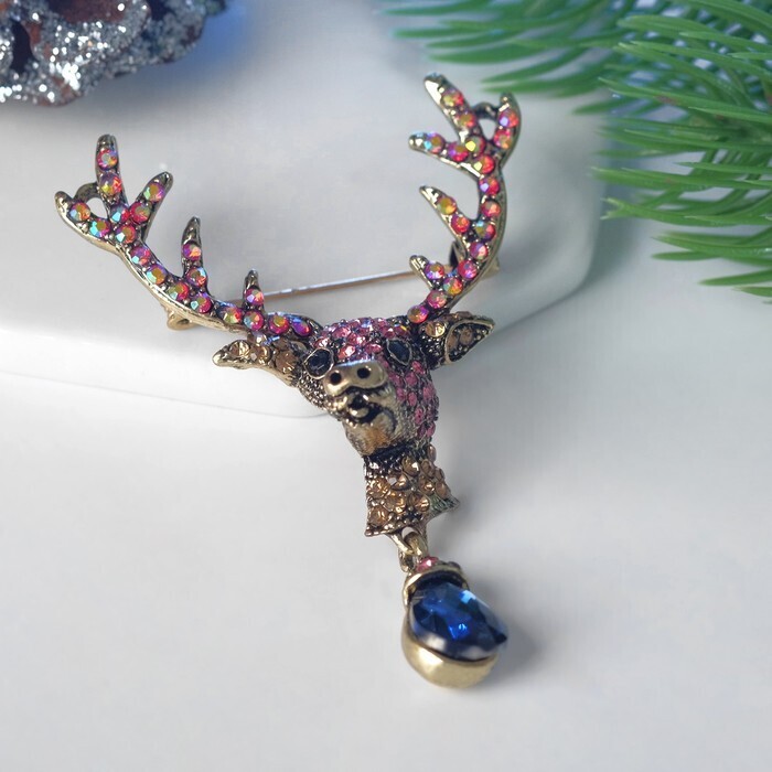 !09 Брошь "Олень с капелькой", цвет розово-синий в золоте