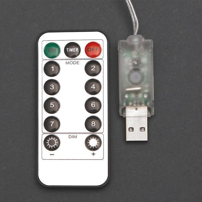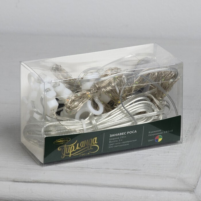 !09 Гирлянда «Занавес» 2.8 × 3 м роса на крючках, с пультом, IP20, серебристая нить, 300 LED, свечение мульти, 8 режимов, USB