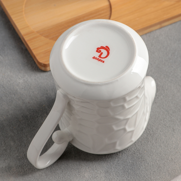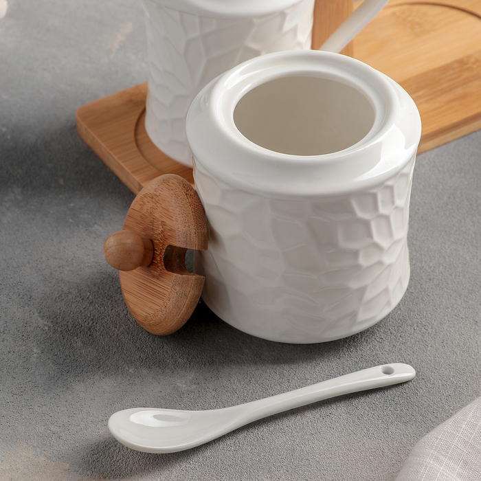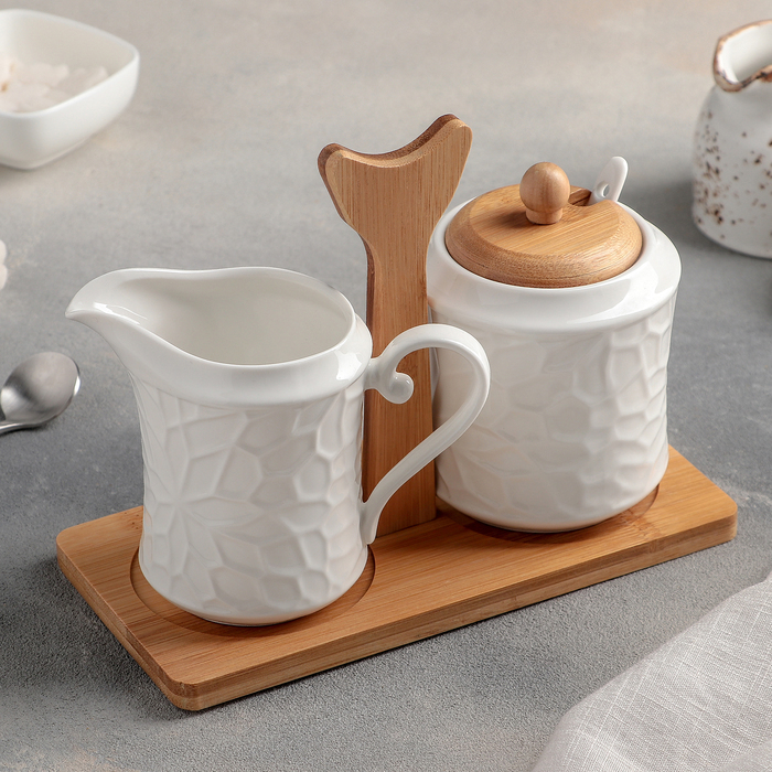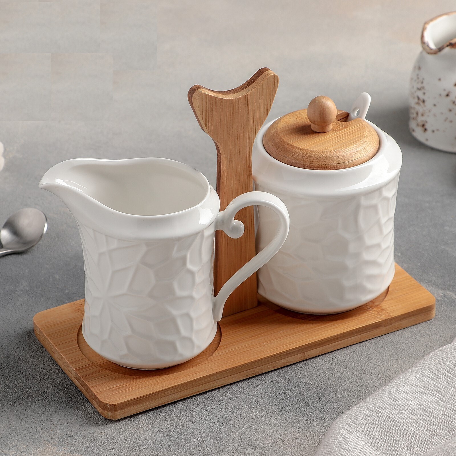 !09 Набор фарфоровый сервировочный на деревянной подставке «Кракле», 2 предмета: молочник 170 мл, сахарница с ложкой, цвет белый