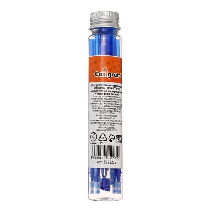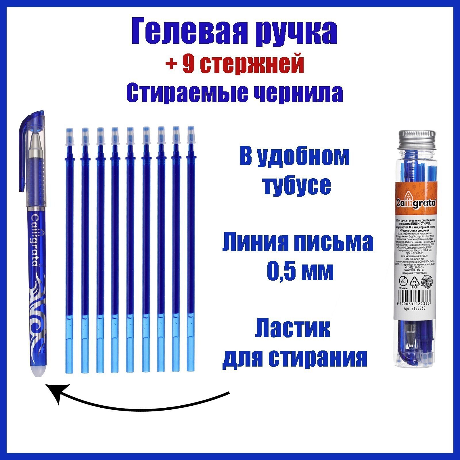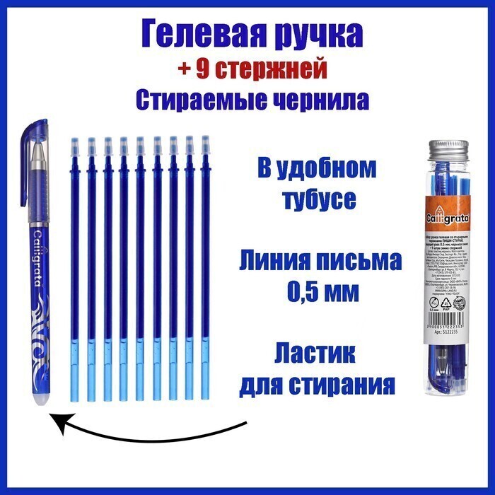 !09 Комплект из 2-х наборов: Набор ручка гелевая со стираемыми чернилами, пишущий узел 0.5 мм, чернила синие+9 синих стержней