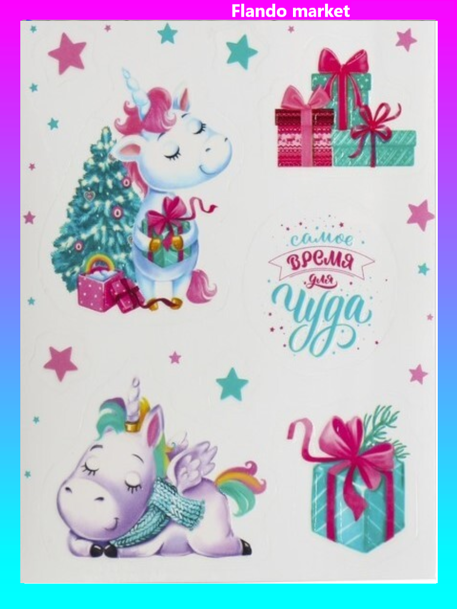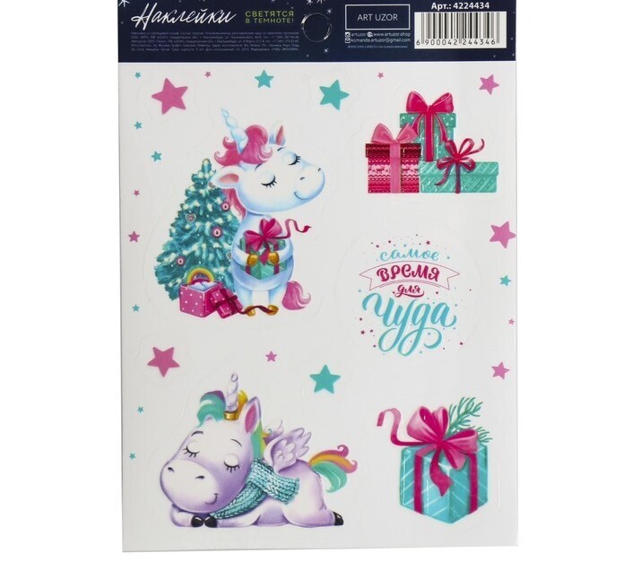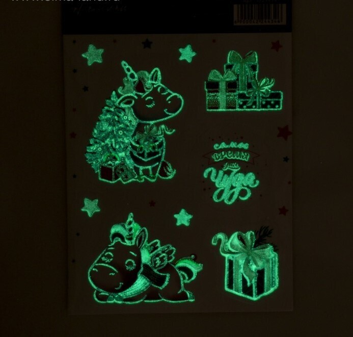 !09 Наклейка (набор 2 штуки) со светящимся слоем «Новогодний единорог», 10,5 х 14,8 см.