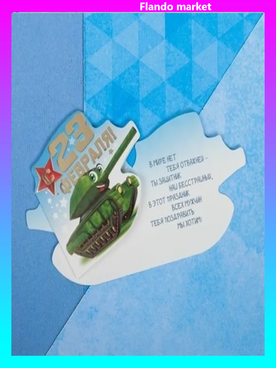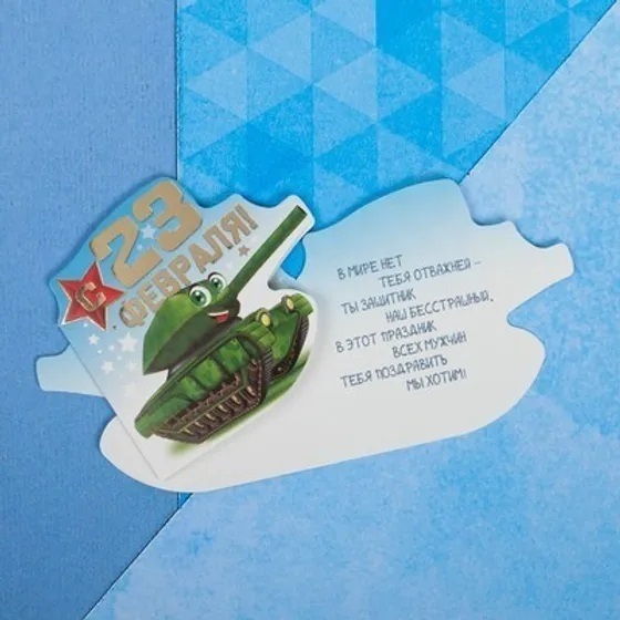 !09 Открытка (набор 5 штук) поздравительная «23 Февраля!» , ТАНК детский, тиснение, 8 × 9 см.
