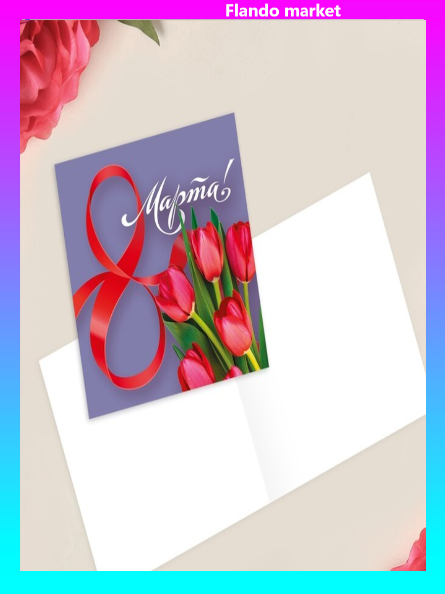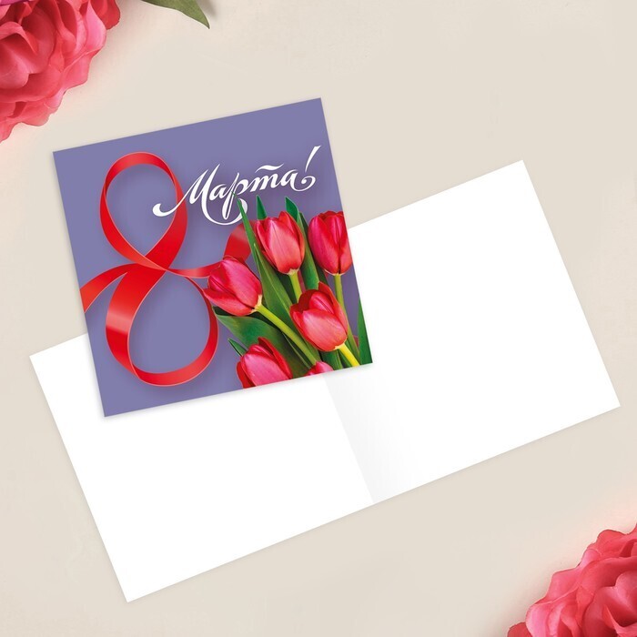 !09 Открытка-мини (набор 5 штук) раскладывающая «С 8 марта» красные тюльпаны, 7 × 7 см.