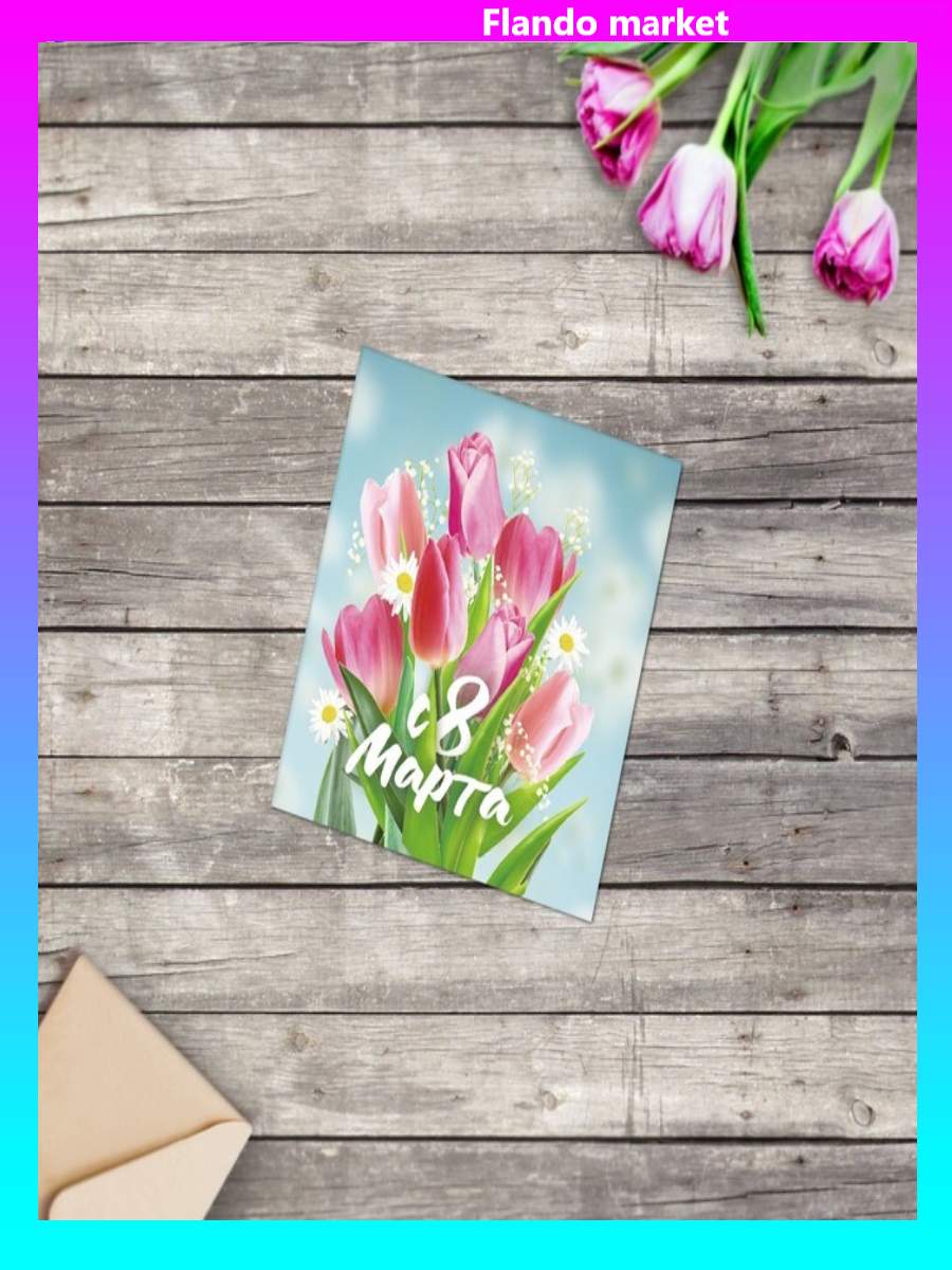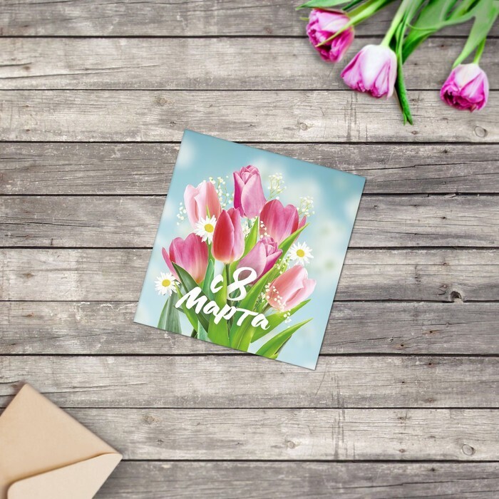 !09 Открытка-мини раскладывающая (набор 10 штук) "С 8 Марта!" розовые тюльпаны, 14 х 7 см.