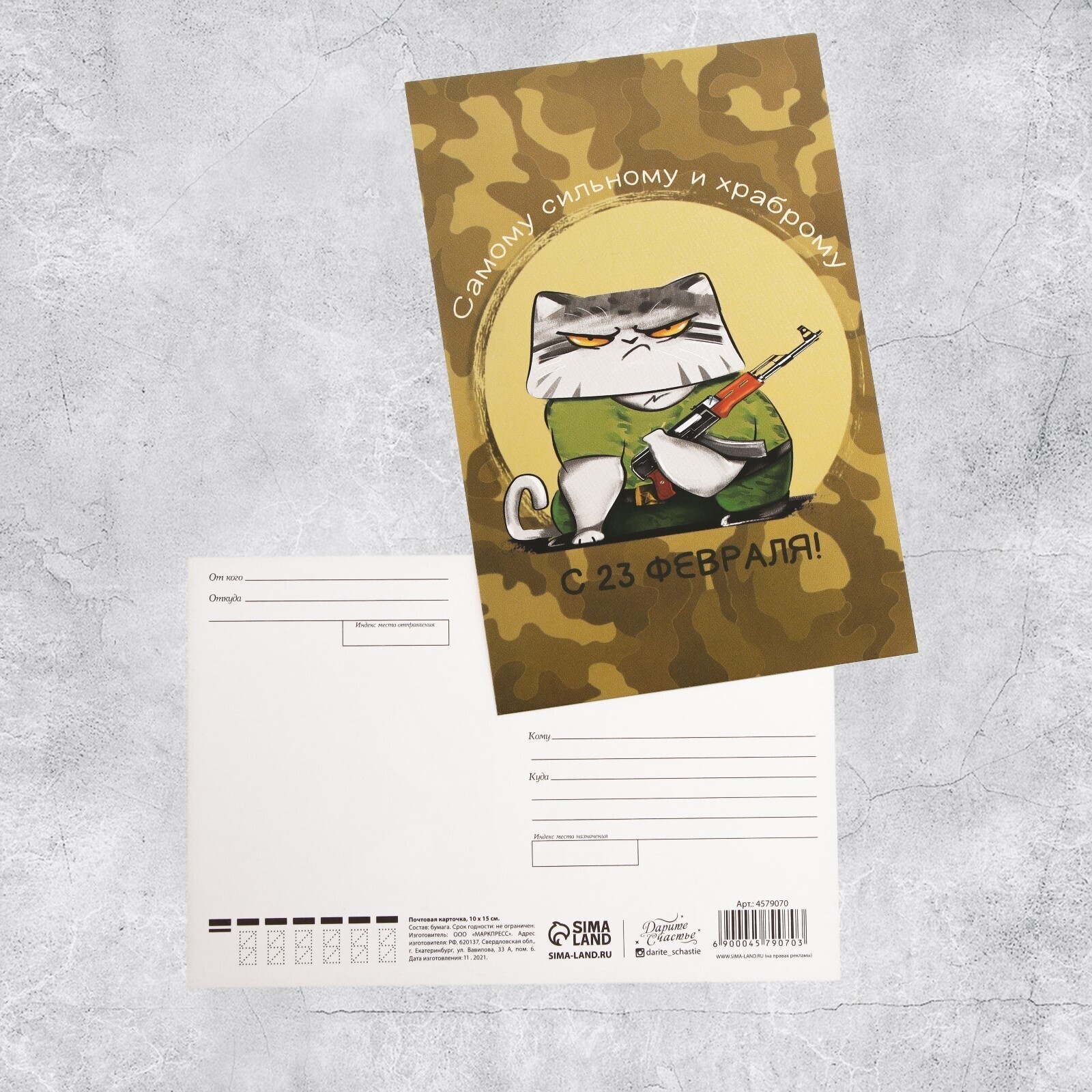 !09 Почтовая карточка (набор 4 штуки) «23 февраля» суровый кот, 10 х 15 см.