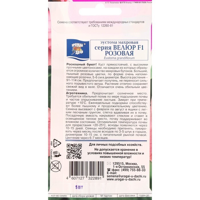 !09 Комплект из 5 упаковок - Семена цветов Эустома махровая "Велюр", розовая, F1, в ампуле,