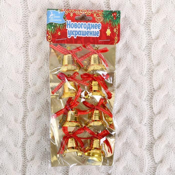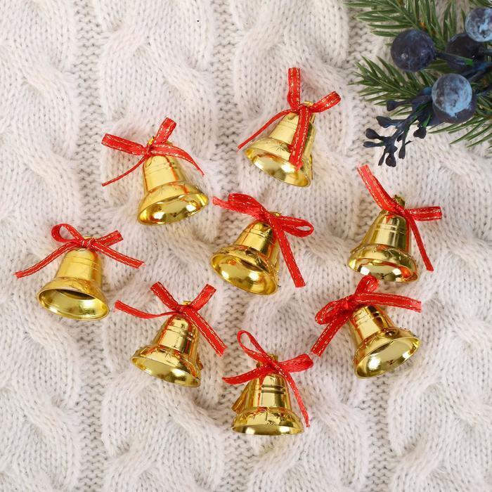 !09 Украшение ёлочное "Колокольчики с бантиком и снежинками" (набор 8 шт) 2 см, красно-золотой