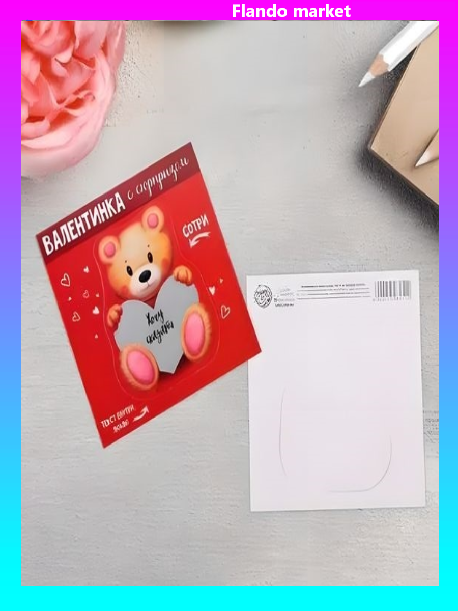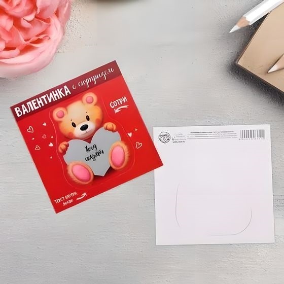 !09 Валентинка (набор 6 штук) со скретч слоем «Хочу сказать», Мишка, 10 х 10 см.